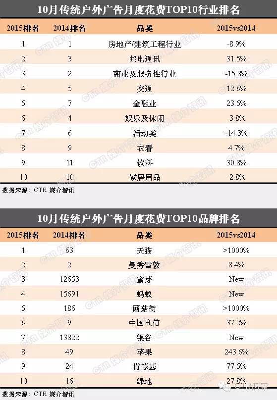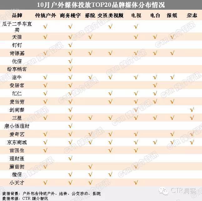 2015年10月户外媒体投放TOP20品牌分布中,投放商务楼宇的品牌占据18席,不论是成熟的快消品、通信产品类客户,还是移动互联网、电子商务类客户,都将商务楼宇电视作为保持曝光,增加知名度的首选。